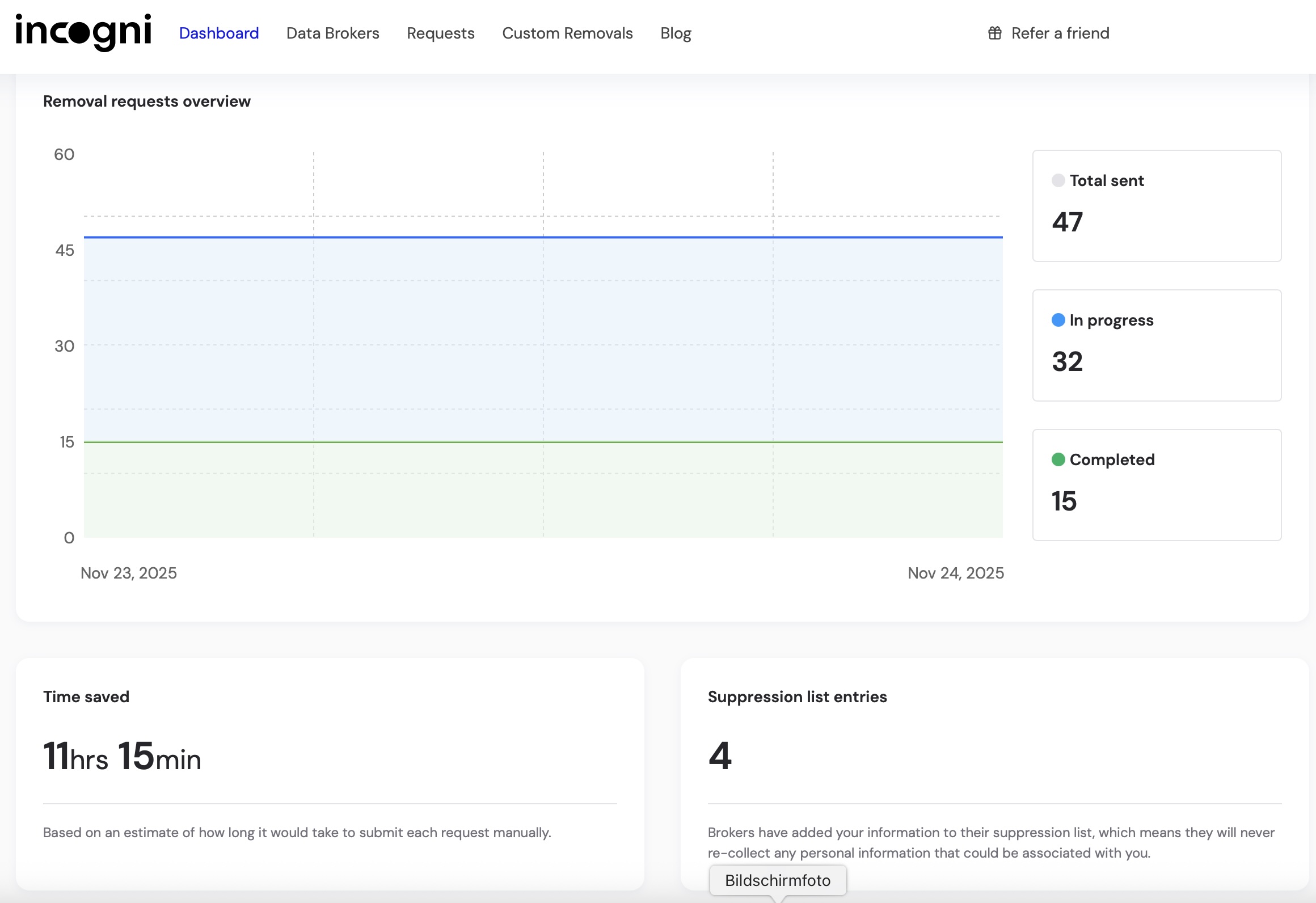 Lass es, wenn du genau wissen willst, welche spezifischen Datensätze (Inhalt) gelöscht wurden – das zeigt Incogni aktuell nicht im Detail an.